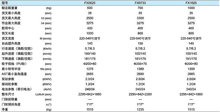 ◆ 充電器參數:輸入220V/50Hz,輸出30A/24V ◆ FE、FS型可調貨叉可定制,可調范圍340-720mm ◆ Fn系列支腿外寬為1197-1502可調 ◆ 最小直角通道AST是按照托盤尺寸(長×寬)1200mm×l000mm計算出來的 ◆ 對于貨叉可調型,貨叉必須對稱調節,防止偏載失衡