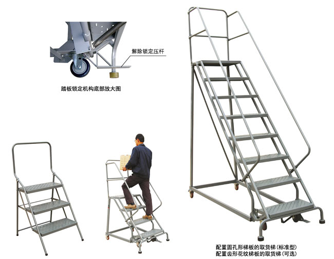 ● 配置踏板鎖定機(jī)構(gòu).踩壓底部踏板可自動(dòng)固定梯子;踩壓底部踏板下方的解除鎖定壓桿,便可輕松移動(dòng)取貨梯